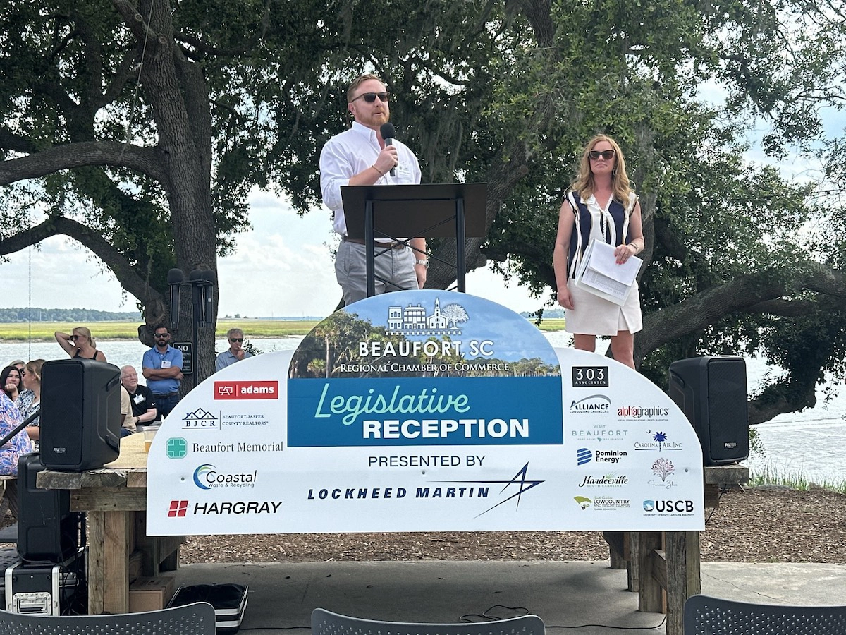 Port Royal Mayor Kevin Phillips gives closing remarks to attendees at the Beaufort Regional Chamber of Commerce Legislative Reception at Shellring Ale Works on June 7, 2024. Amber Hewitt/The Island News