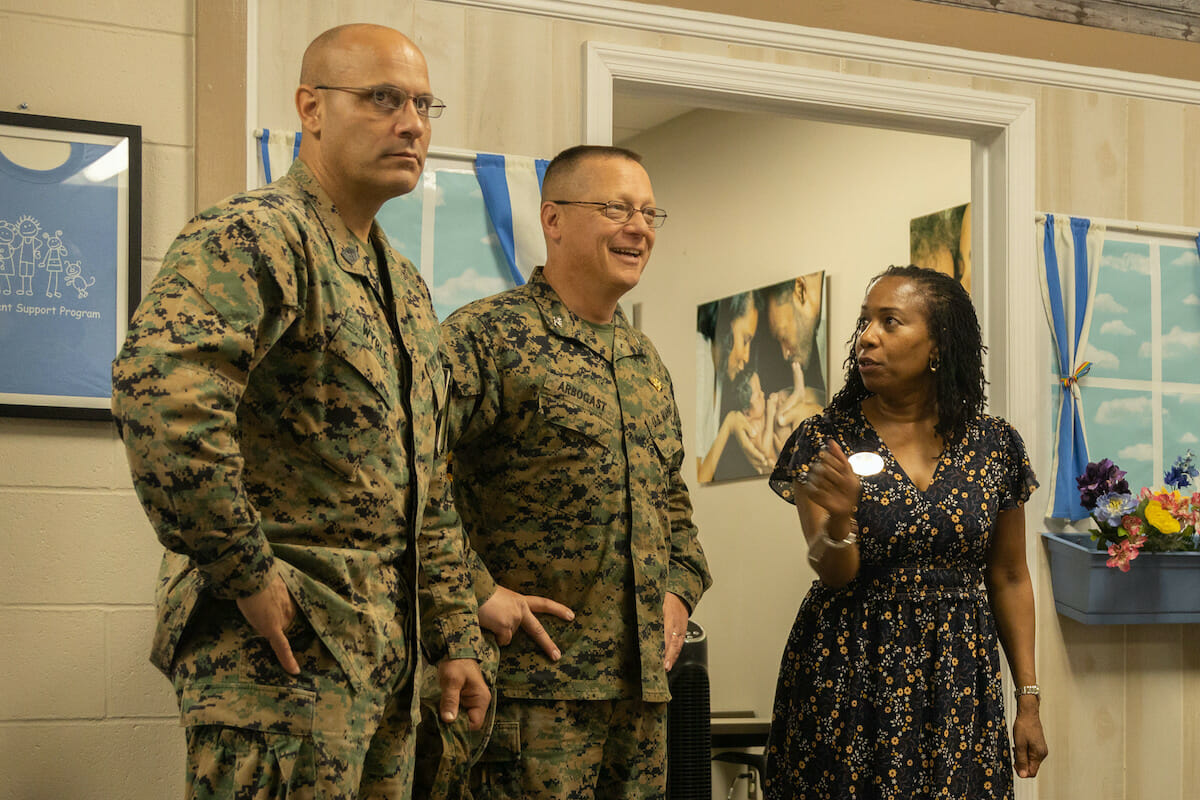 U.S. Marine Corps Col. Karl Arbogast, commanding officer, Marine Corps Air Station (MCAS) Beaufort, and Sgt. Maj. Jonathan Wyble, sergeant major, MCAS Beaufort, receive a tour Thursday, Dec. 8, of the New Parent Support Program’s playroom and baby bootcamp classroom at MCAS Beaufort from Glenda Mitchell, Family Advocacy Program, new parent support program acting supervisor. The New Parent Support Program hosts weekly play mornings, which allows children the opportunity to experience peer-to-peer interaction and allows parents to build social support with one another. Photos by Sgt. Cheyeanne Campbell/USMC