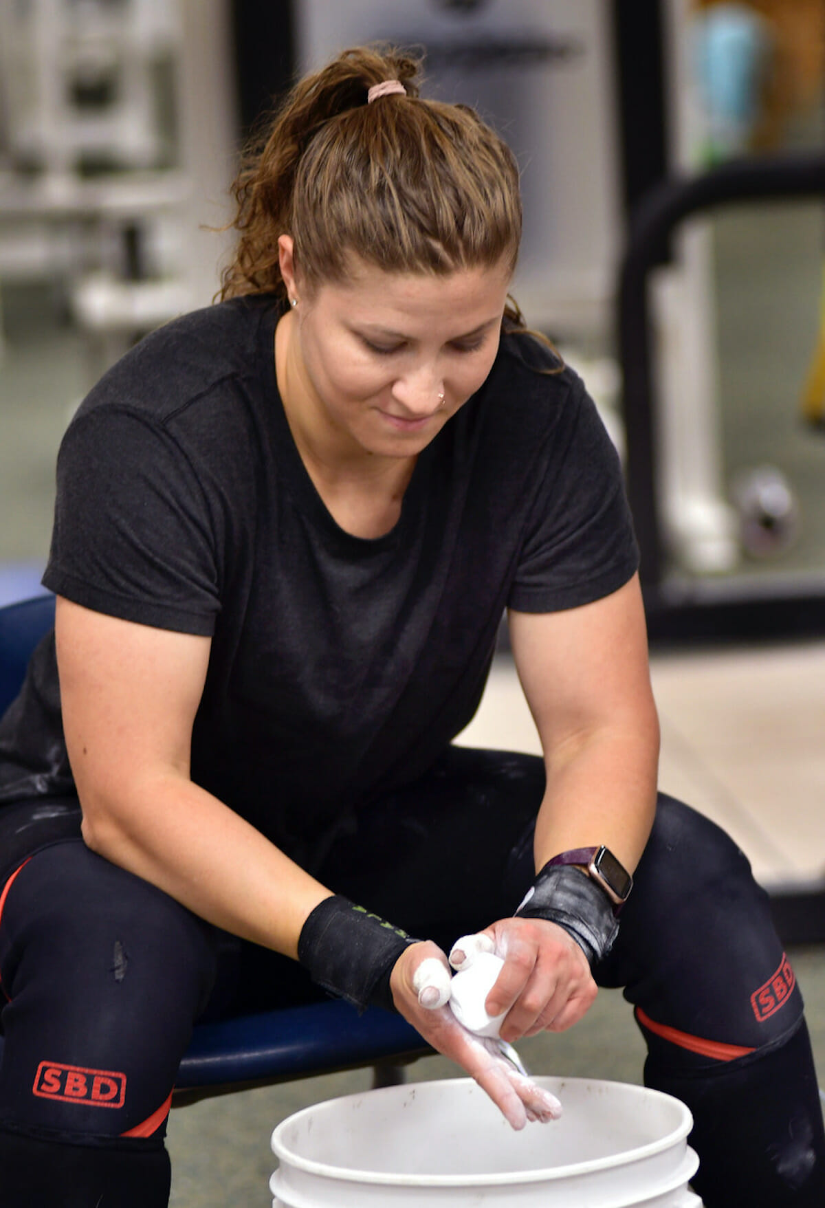 Team Beaufort’s Mahassen Hala Fattouh of Lebanon, chalks her hands during a workout earlier this month before leaving for the 2020 Summer Olympics in Toyko. Photo by Bob Sofaly.