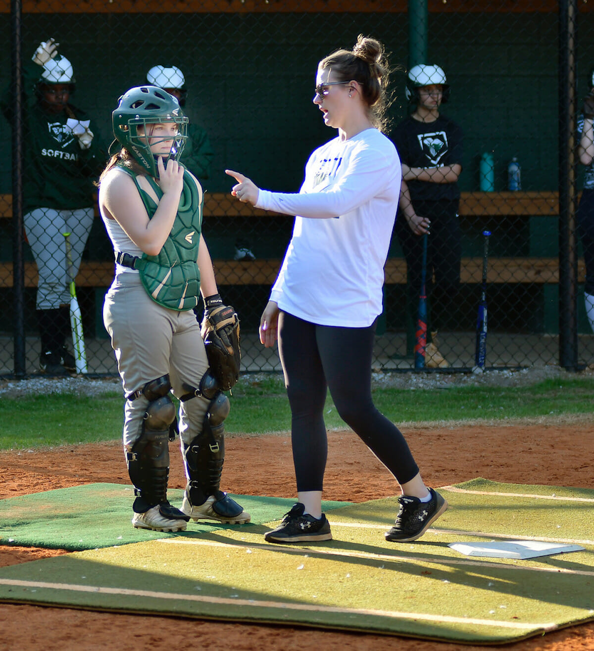 Beaufort High School assistant softball coach Kashmire Rentz, right, gives some pointers to catcher Jordyn Ramirez during practice Thursday afternoon, Feb. 24. The Lady Eagles host the Dolphins of Battery Creek in a non-region contest at 7 p.m., Thursday, March 7.