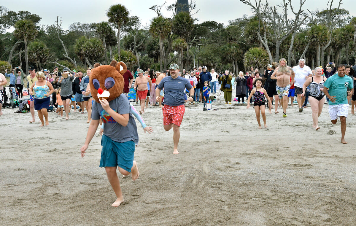 The weather was good, and several hundred plungers rumbled down the beach at Hunting Island State Park and into the cold surf, many wearing costumes ranging from shrimp to Winnie The Pooh to the pelican himself – or herself.