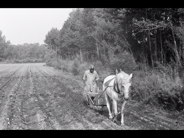 In the more than 30 photos, Mitchell can be seen steering a wooden plow being pulled by a white horse down neatly tilled rows or staring intently into the camera as if preoccupied by thoughts of the day.