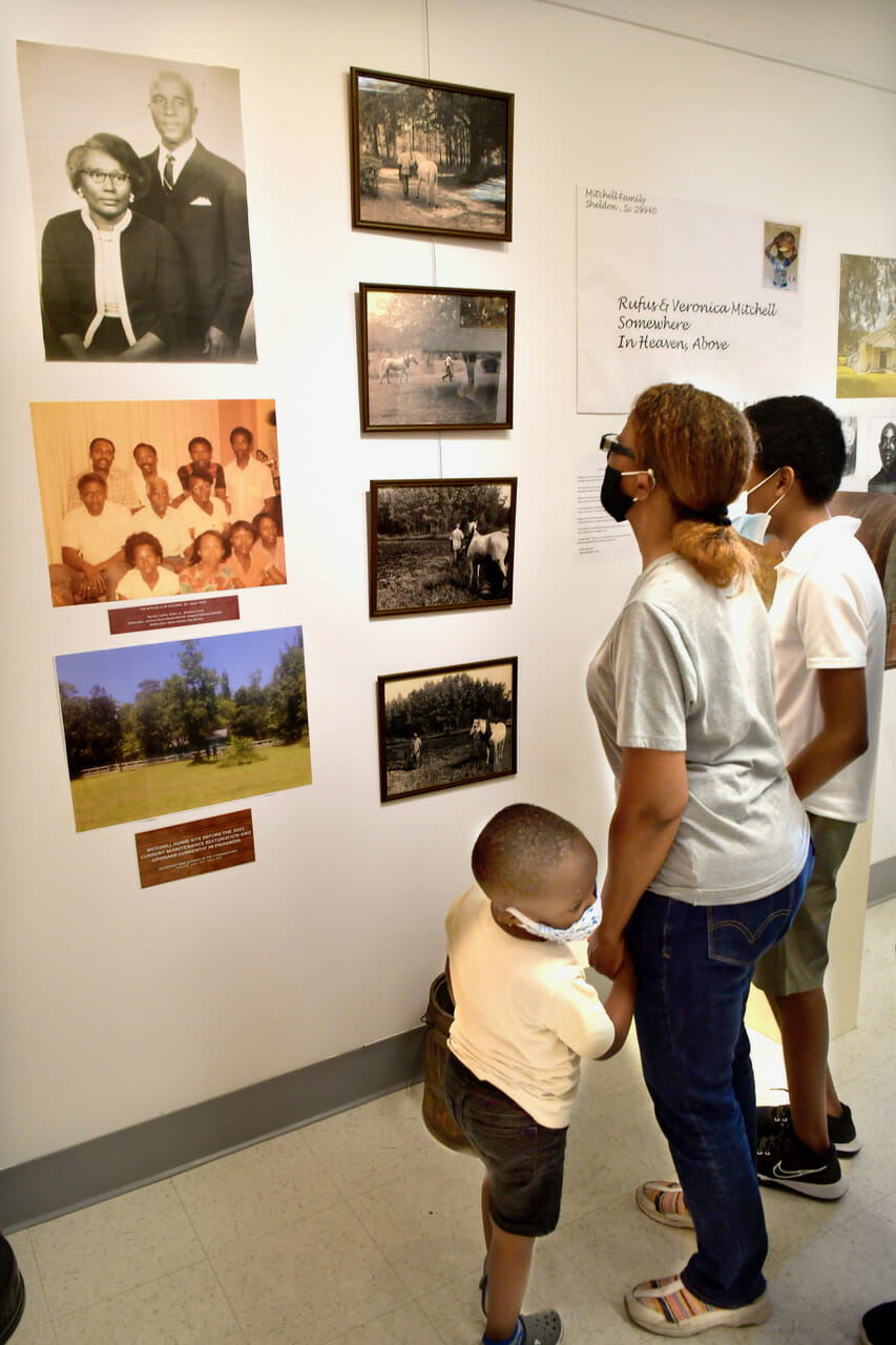 Left: Andy Tate, left, chats with Beaufort Mayor Stephen Murray after the grand opening of the Ancestor of the Land exhibit Thursday in the Beaufort Arts Council’s Exhibition Hall in the Mather School Museum at the Technical College of the Lowcountry. The Exhibit will is free and open to the public from 11 a.m. to 4 p.m., Thursday through Saturday. Photos by Bob Sofaly.