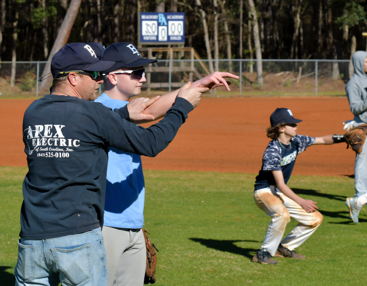 Danny McElhany, left, head coach of Beaufort Acadmy’s baseball team, said one of his biggest challenges is the experience of his team. Some players have never played organized baseball before while other have played on more advance “club” teams.