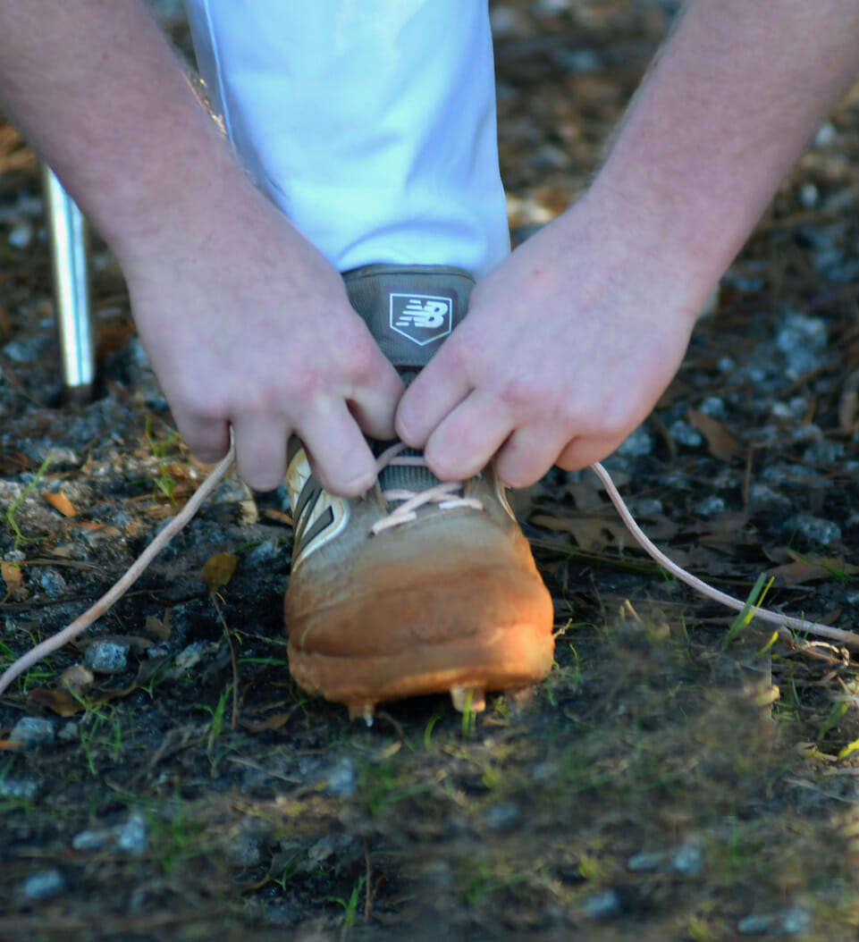 After a 15-year hiatus, baseball spikes are being worn on the baseball diamond at Beaufort Academy. Here, John Howell laces up his shoes as he gets ready for practice.