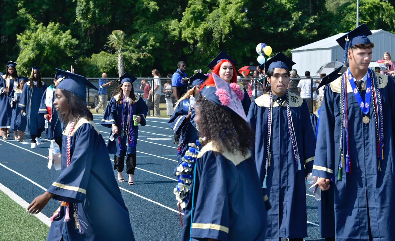 Some of the 194 graduating seniors make their way two-by-two to their seats to kick off the 2024 Commencement Exercises on Thursday, June 6, at Battery Creek High School. Bob Sofaly/The Island News