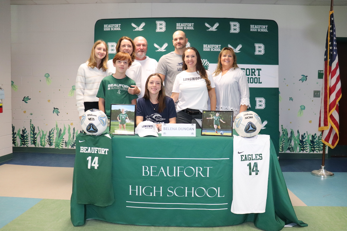 Beaufort High School’s Selena Duncan, pictured surrounded by her family, has signed to play soccer at Longwood University. Photo courtesy of Beaufort High School