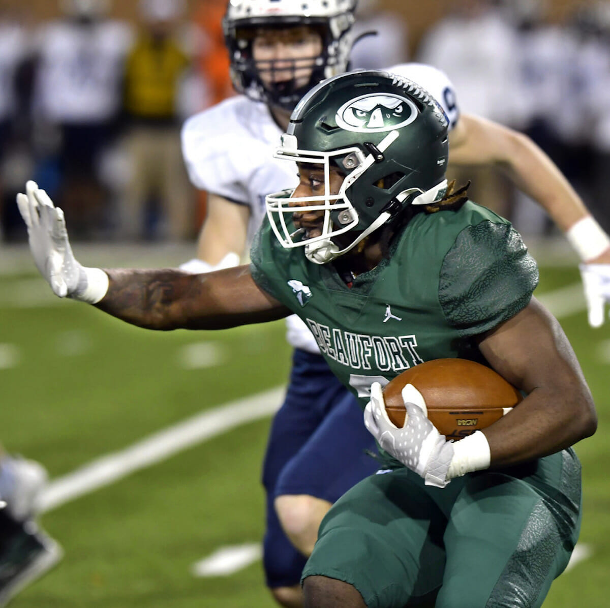 The last thing a would-be tackler sees before trying to bring down Beaufort’s Kacy Fields is his legendary “stff arm” to the face as seen here during the Eagle’s Class 3A State Championship game against Powdersville High School from Greeneville. The Eagles bested the Patriots 41-31 to become the new Class 3A state champions. Bob Sofaly/The Island News
