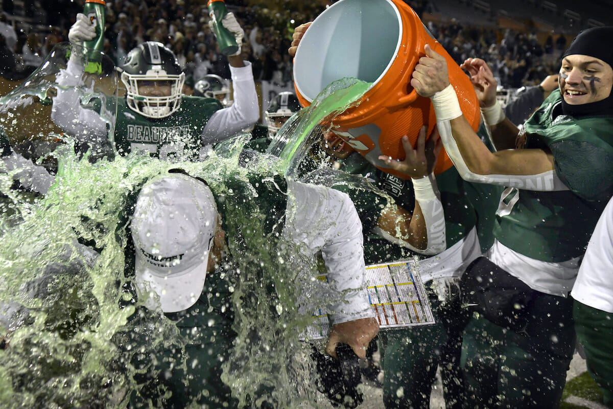 Beaufort High School head football coach Bryce Lybrand gets the traditional Gatorade bath after his Eagles defeated the Patriots of Powdersville 41-31, Thursday in Columbia to become the Class 3A State Champions. Bob Sofaly/The Island News