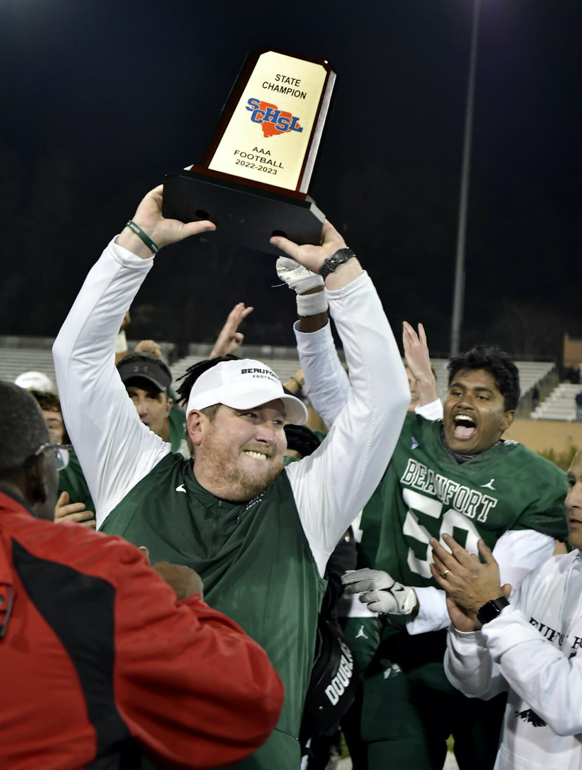 Beaufort High School head football coach Bryce Lybrand holds up the Class 3A State Champion trophy for all to see after defeating Powdersville of Greenville 41-31, Thursday night in Columbia. Bob Sofaly/The Island News