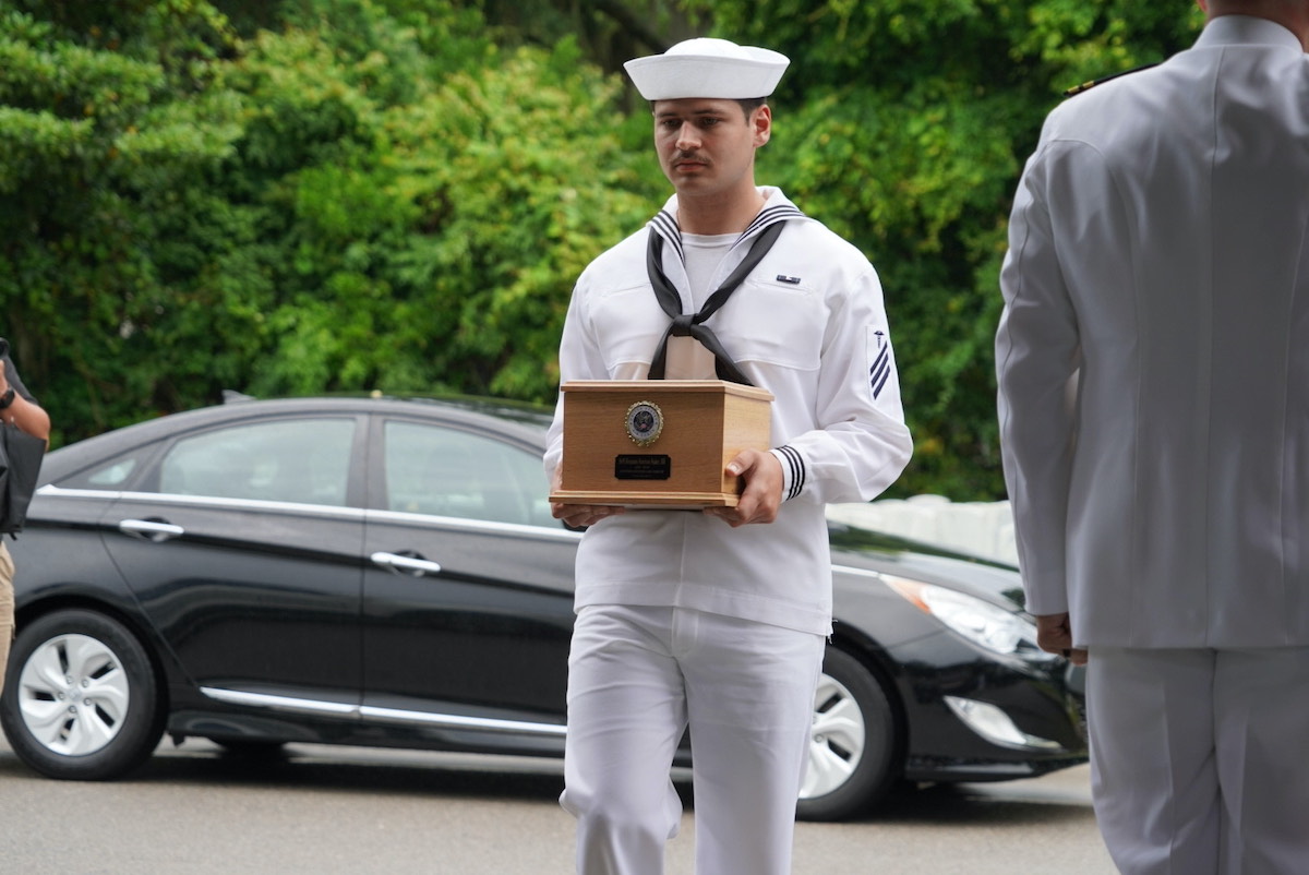 A member of the U.S. Navy brings forward a veteran’s’ urn during the Committal Service for two unclaimed veterans, Benjamin Harrison Hyder III and Lewis Melvin Coy III, on May 10,2024 at Beaufort National Cemetery. Amber Hewitt/The Island News
