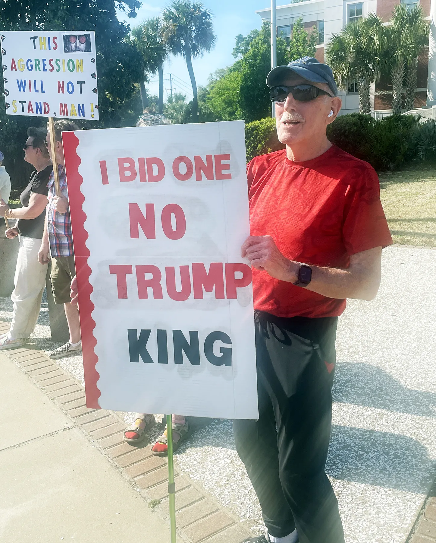 A protester shows off his sign in front of Beaufort City Hall on Boundary Street on Saturday, April 19, 2025. The protesters were among those who came out to join a national protest organized by 50 50 1 to speak out against policies that are being enacted by President Donald Trump’s administration. Jeff Evans/The Island News