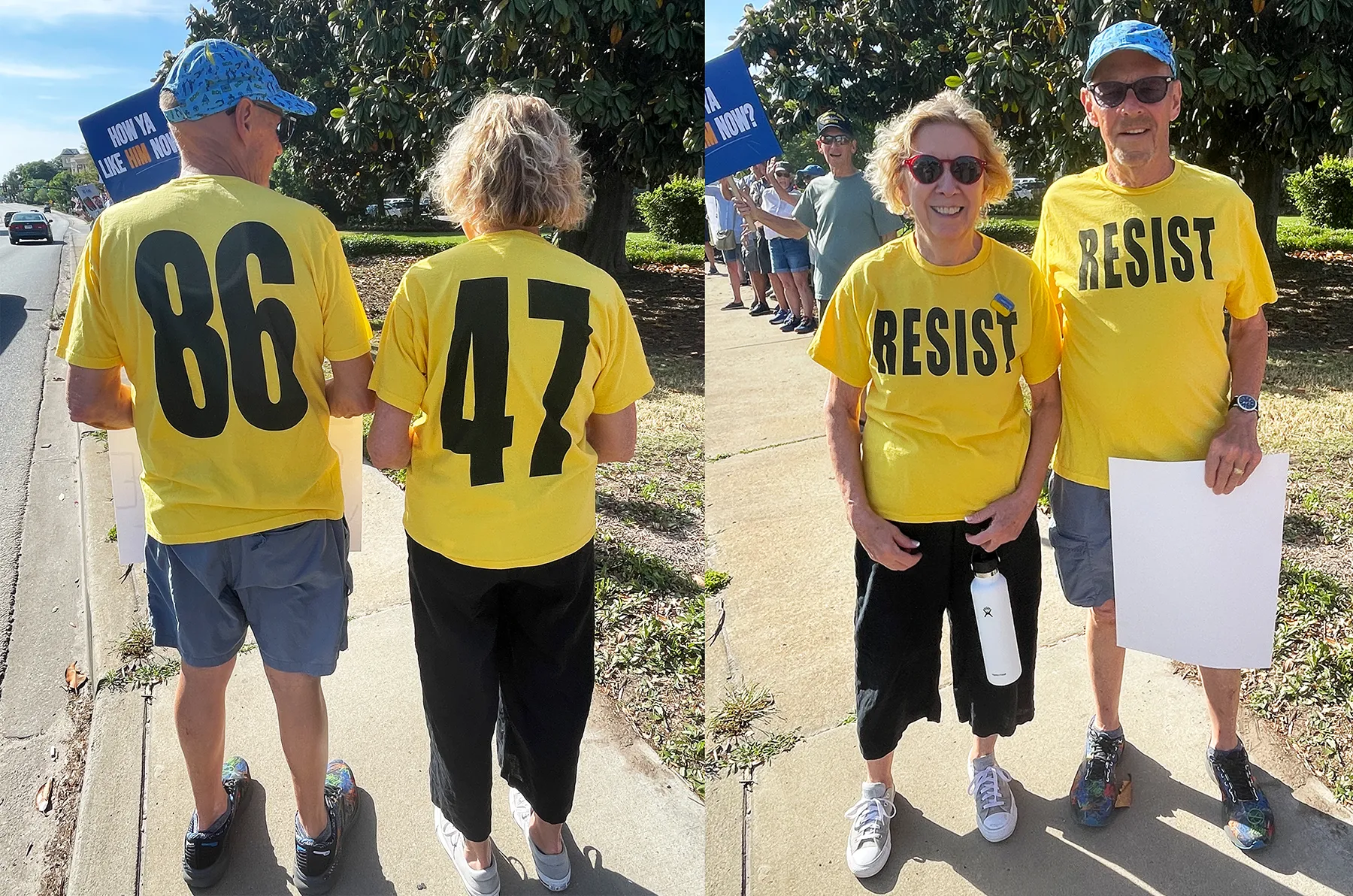 Mary Flynn and Jim O’Brien show off their shirts in front of Beaufort City Hall on Boundary Street on Saturday, April 19, 2025. Flynn and O’Brien were among those who came out to join a national protest organized by 50 50 1 to speak out against policies that are being enacted by President Donald Trump’s administration. Jeff Evans/The Island News