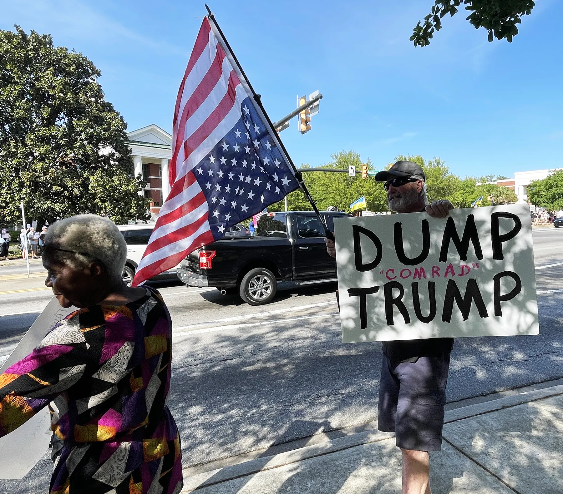 Protester Scott Ruffridge holds his “Dump Trump” sign, as well as an upside down American Flag, a sign of distress, in front of Beaufort City Hall on Boundary Street on Saturday, April 19, 2025. Ruffridge was among those who came out to join a national protest organized by 50 50 1 to speak out against policies that are being enacted by President Donald Trump’s administration. Jeff Evans/The Island News