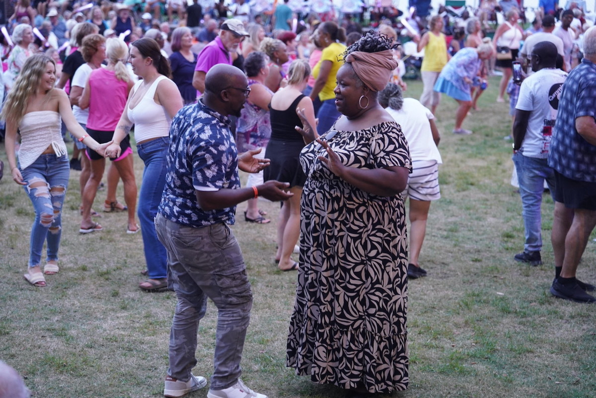 Shaneka Reid and Channing Hinton from Jacksonville Fla., dance among the crowd during the Motown Monday event on Monday, July 14, 2025. Amber Hewitt/The Island News