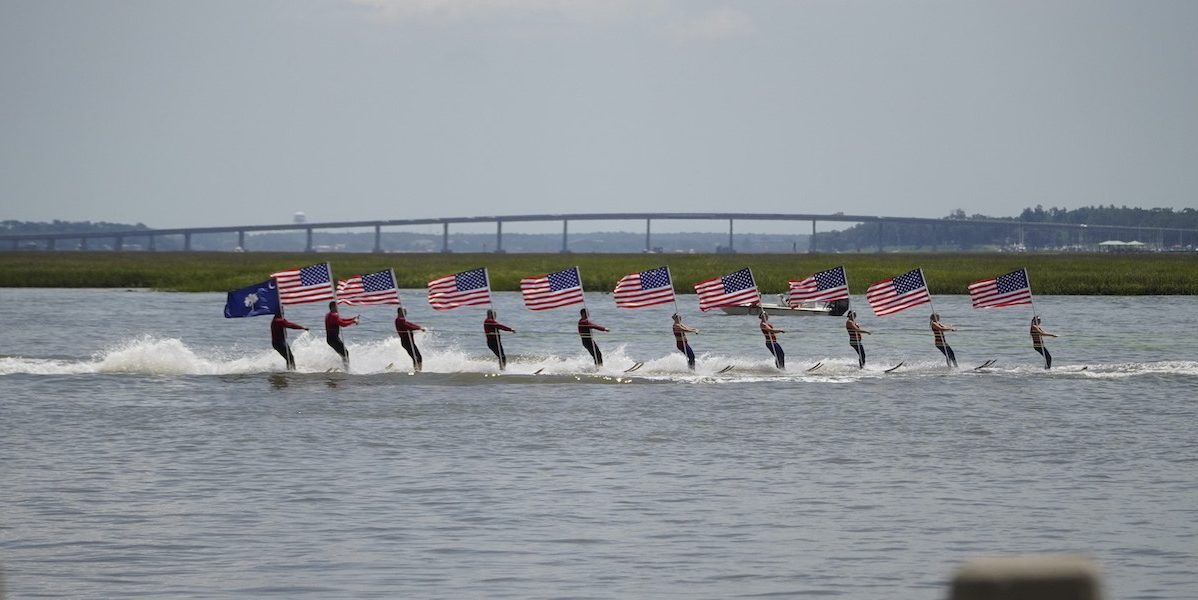 The Gatorland Ski Show Team holds up the American and South Carolina State Flags as they ski past attendees watching from behind the fencing during the 69th Annual Beaufort Water Festival Ski Show on Sunday, July 13, 2025. Spectators watched from behind the fencing because of the promenade area of Henry C. Chambers Waterfront Park being closed due to safety concerns regarding structural issues found underneath. Amber Hewitt/The Island News