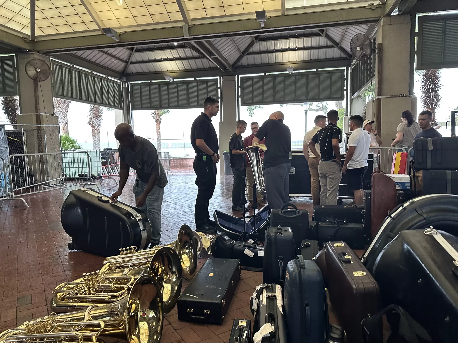 The Parris Island Marine Band lines its instruments up on the floor under the pavilion at Henry C. Chambers Waterfront Park in hopes the rain will pass. Ultimately, the 69th annual Beaufort Water Festival chose to cancel Opening Ceremony events on Friday, July 11, 2025. Amber Hewitt/The Island News