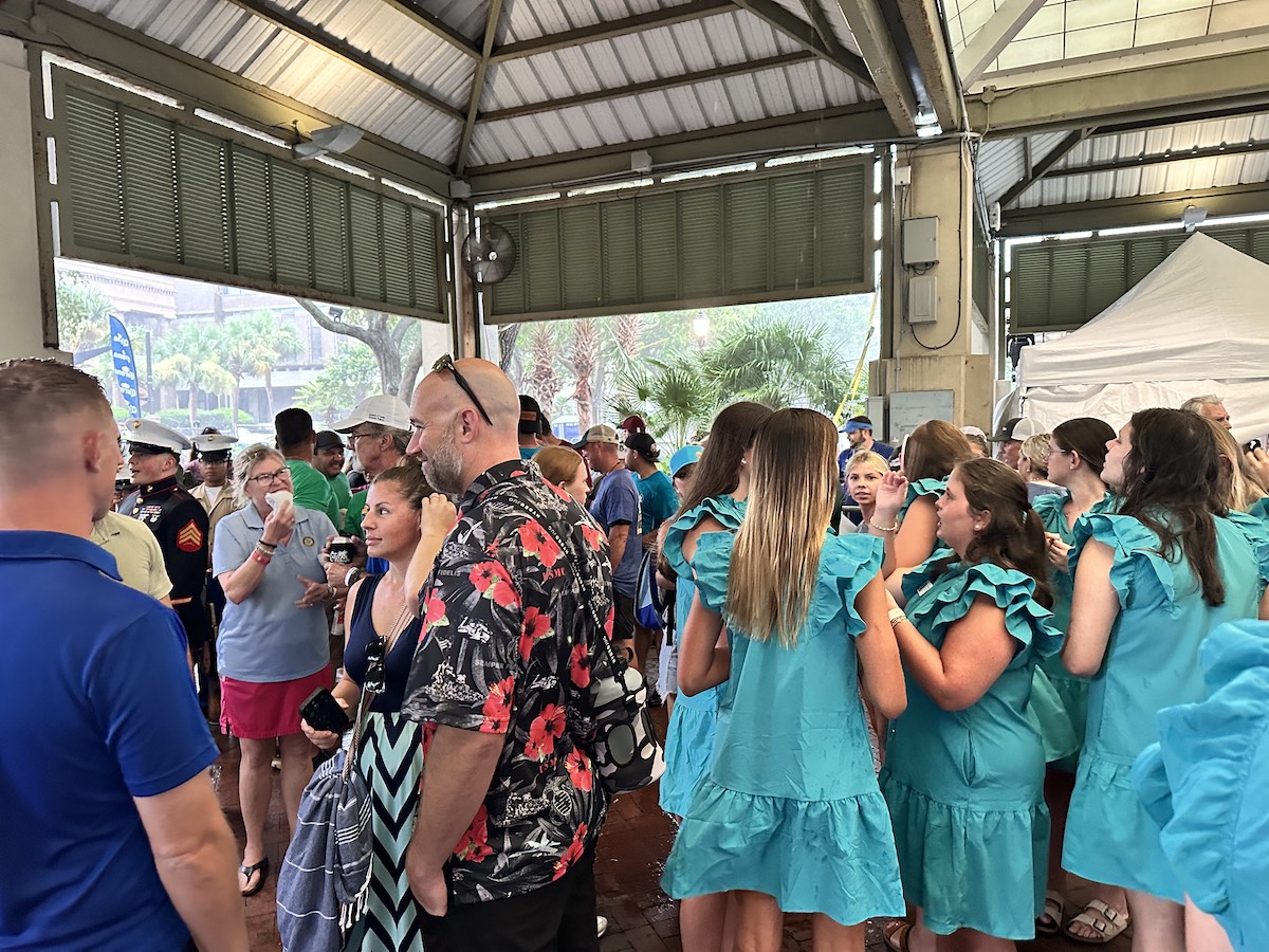Festival goers huddle together under the pavilion at Henry C. Chambers Waterfront Park in hopes the rain will pass. Ultimately, the 60th annual Beaufort Water Festival chose to cancel Opening Ceremony events on Friday, July 11, 2025. Amber Hewitt/The Island News