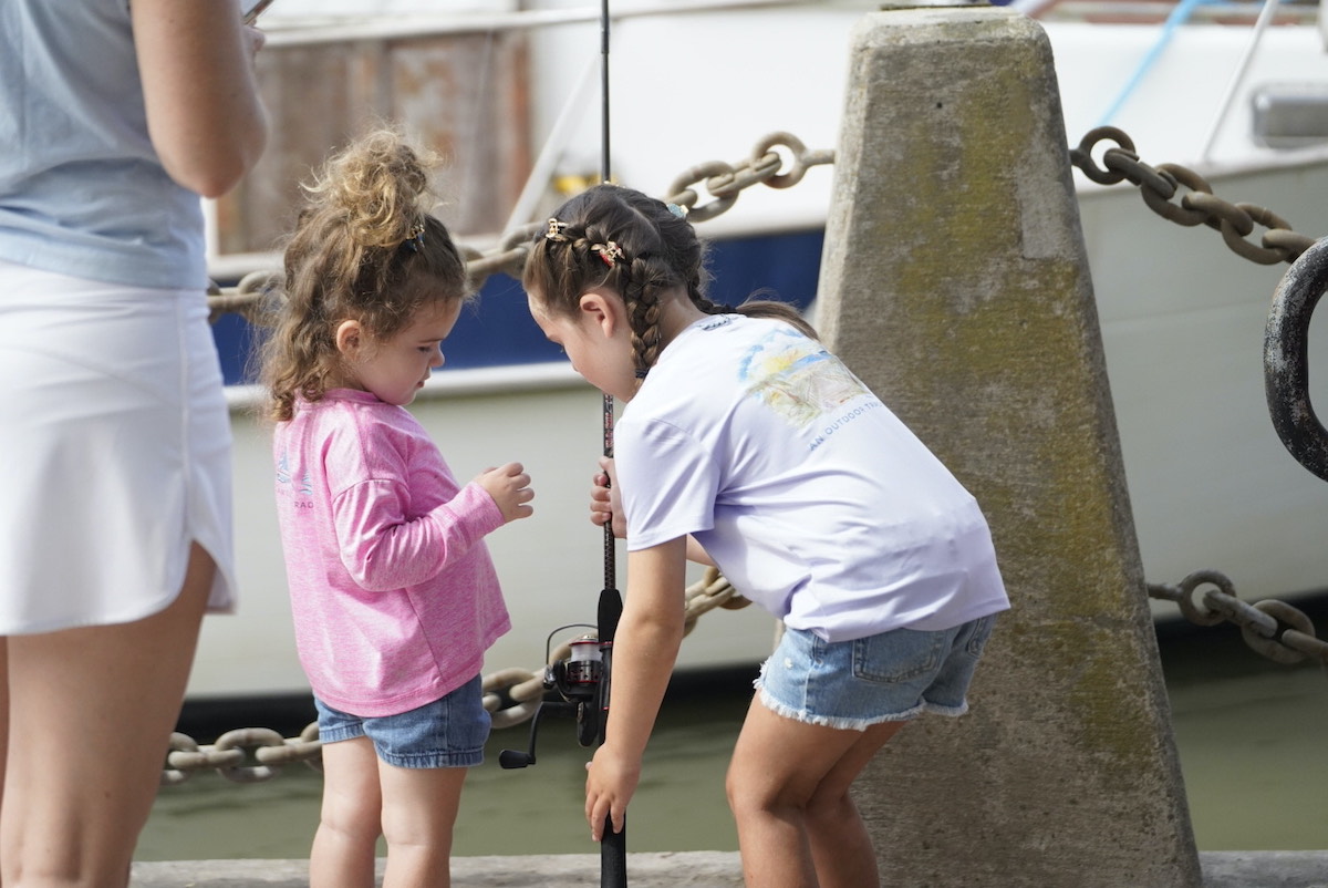 Griffin Dyches, 6, teaches Anna Webb Dyches, 3, both from Clinton, S.C., how to hold the fishing pole during the Children’s Toad Fishing Tournament. Amber Hewitt/The Island News