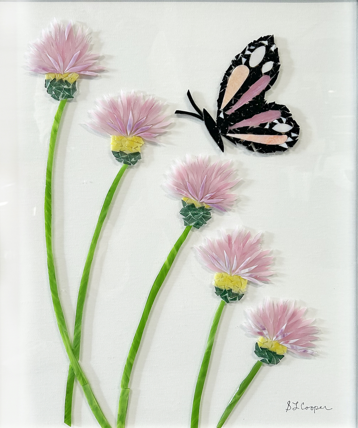 Butterflies have long been a symbol of hope and transformation, and a concept Cooper can relate to with art inspiring a second career in her life. Who can resist the intricate delicate patterns of color and translucent appearance of the wings? They are perfect subject for the medium of colorful Mosaic Glass.