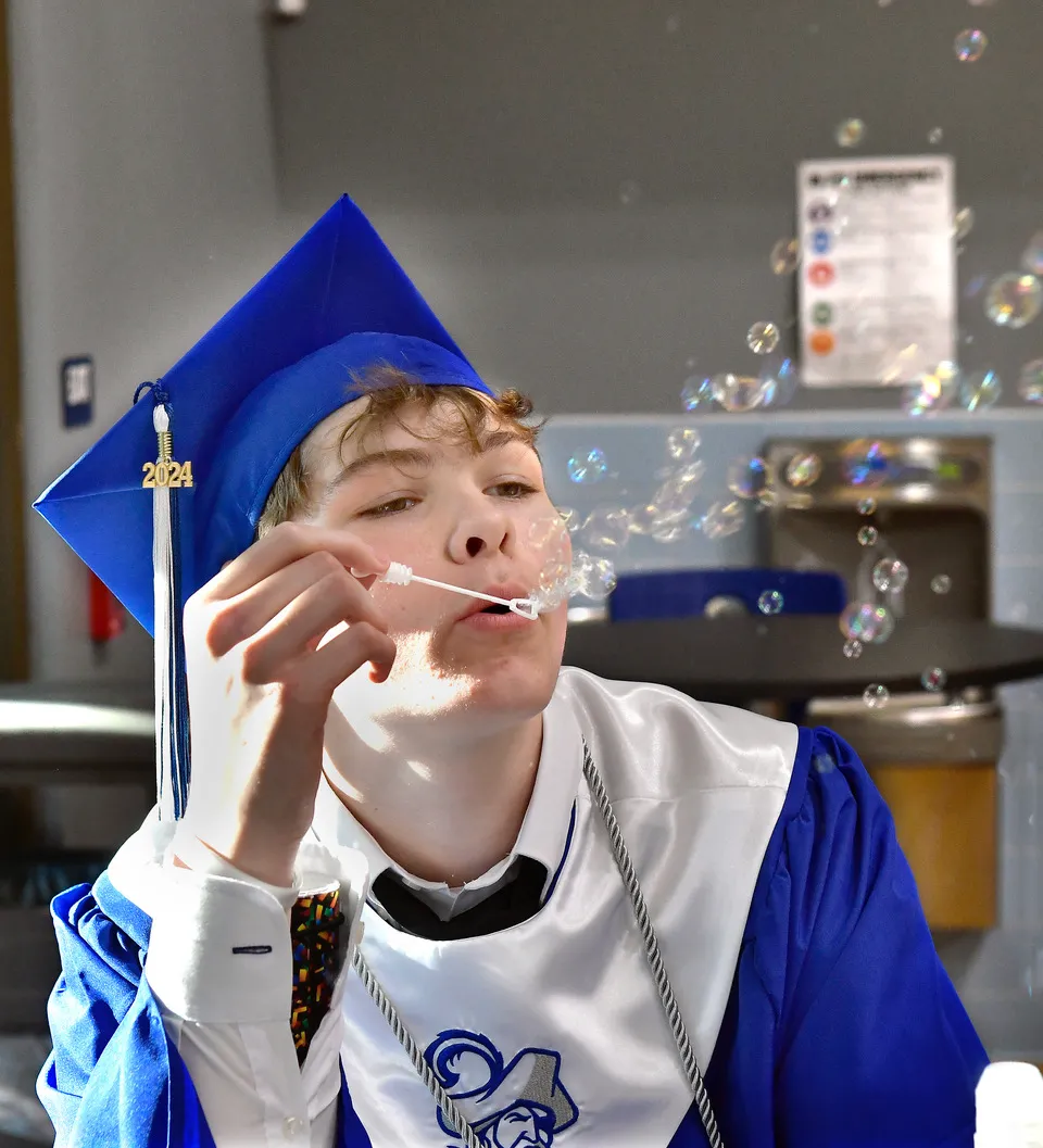 Riley Farley, one of 66 graduating seniors at Bridges Preparatory School, took to blowing bubbles as he and his classmates wait for their graduation ceremony to begin Friday, May 31. Farley said he was “just chillin.’” Bob Sofaly/The Island News