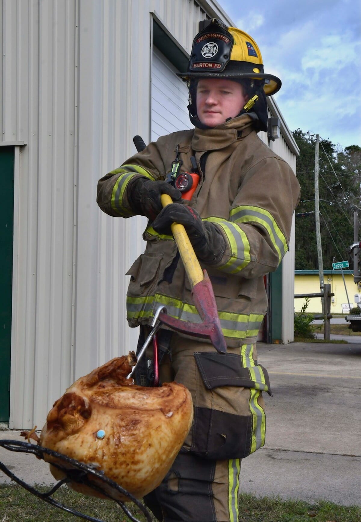 3: After the fire had burned itself out, Firefighter/EMT Cory Hagan removes the turkey from the pot of hot peanut oil. Frying turkey in the Low Country has become very popular. Capt. Dan Byrne of the Burton Fired Dept. said the majority of fire calls are kitchen fires usually started by unattended cooking on the stove.