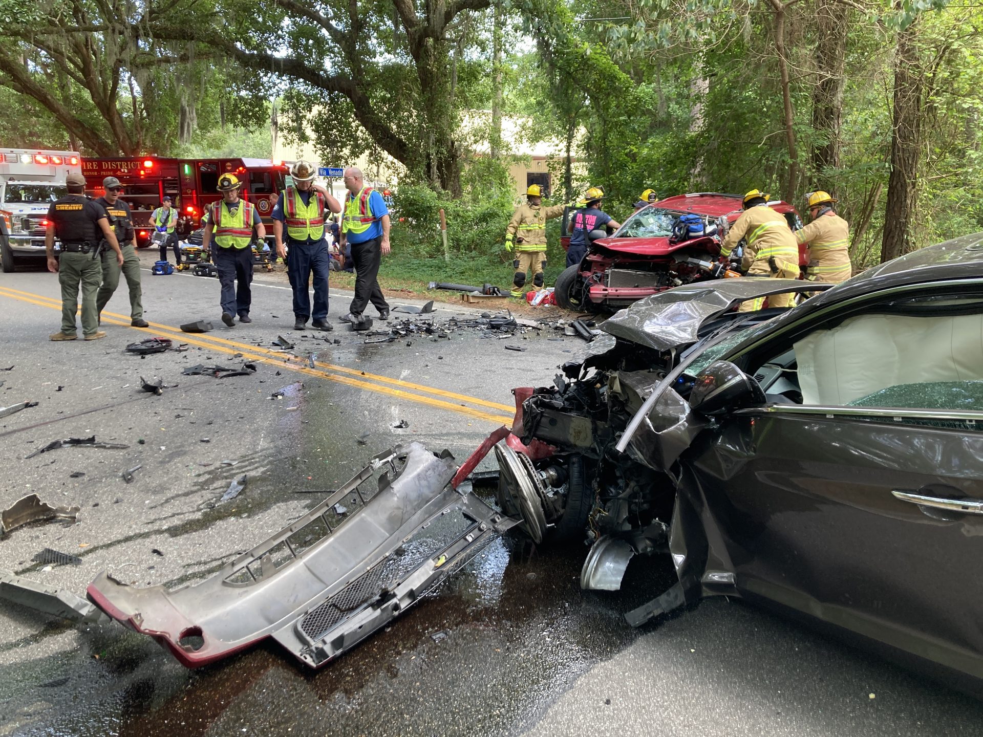 The second collision occurred just after 3:30 p.m. at Joe Frazier Road and Via Venado. Burton firefighters arrived to a collision between two passenger vehicles with both suffering heavy damages, and one with a critically injured driver trapped inside.