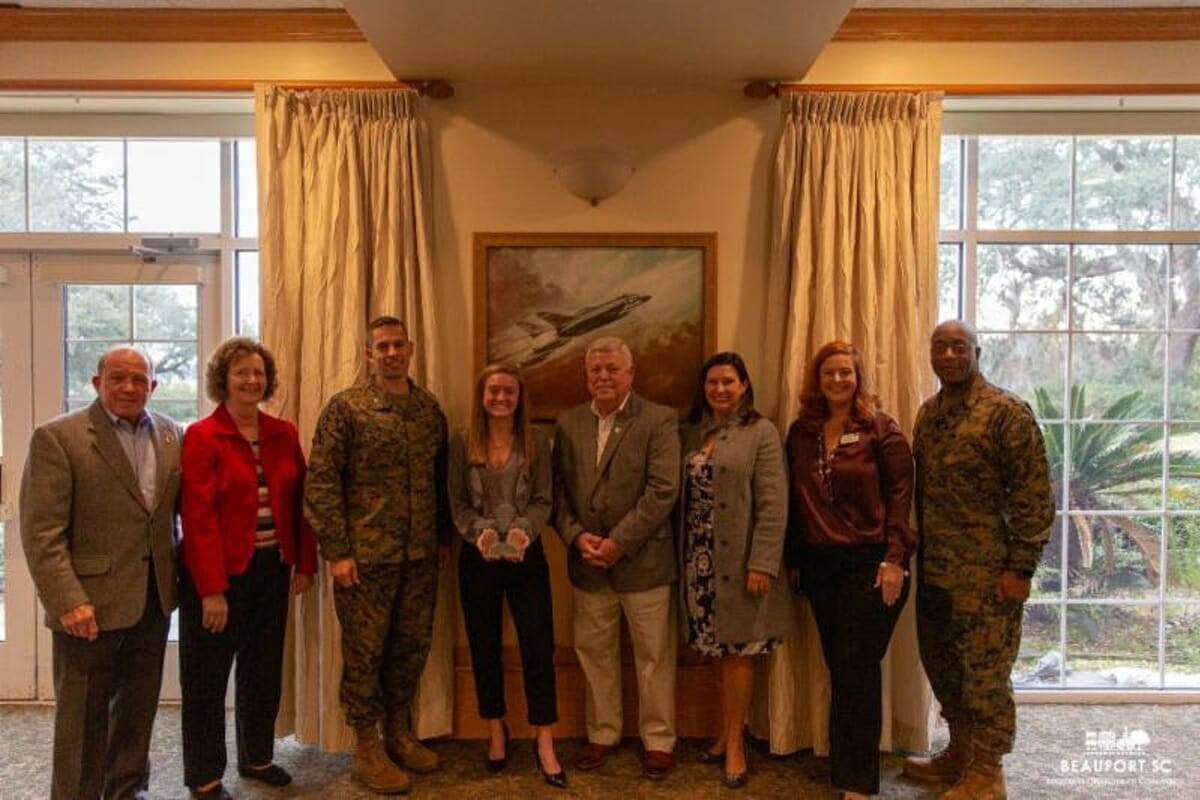 Pictured at top from left to right: Jimmy Boozer, Military Affairs Committee; Alice Howard, Beaufort County Council; Col. Timothy Miller, MCAS Beaufort; Brittany Jamieson, Award Recipient; Bob Bible, Atlantic Marine Corps Communities; Blakely Williams, Beaufort Regional Chamber; Jaime Dailey-Vergara, United Way of the Lowcountry; SgtMaj. Derrick Mays, MCAS Beaufort.