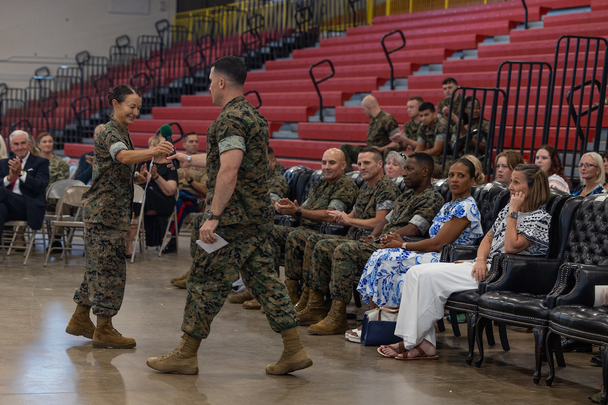 Lt. Col. Shannon R. Hesser, with Support Battalion, relinquishes command of the battalion to Lt. Col. Nathan L. Jeffcoat in a change of command ceremony Friday, June 13, 2025, on Marine Corps Recruit Depot Parris Island. Support Battalion oversees the the training, remediation, and rehabilitation of recruits throughout the recruit training process. Lance Cpl. Ayden Cassano/USMC