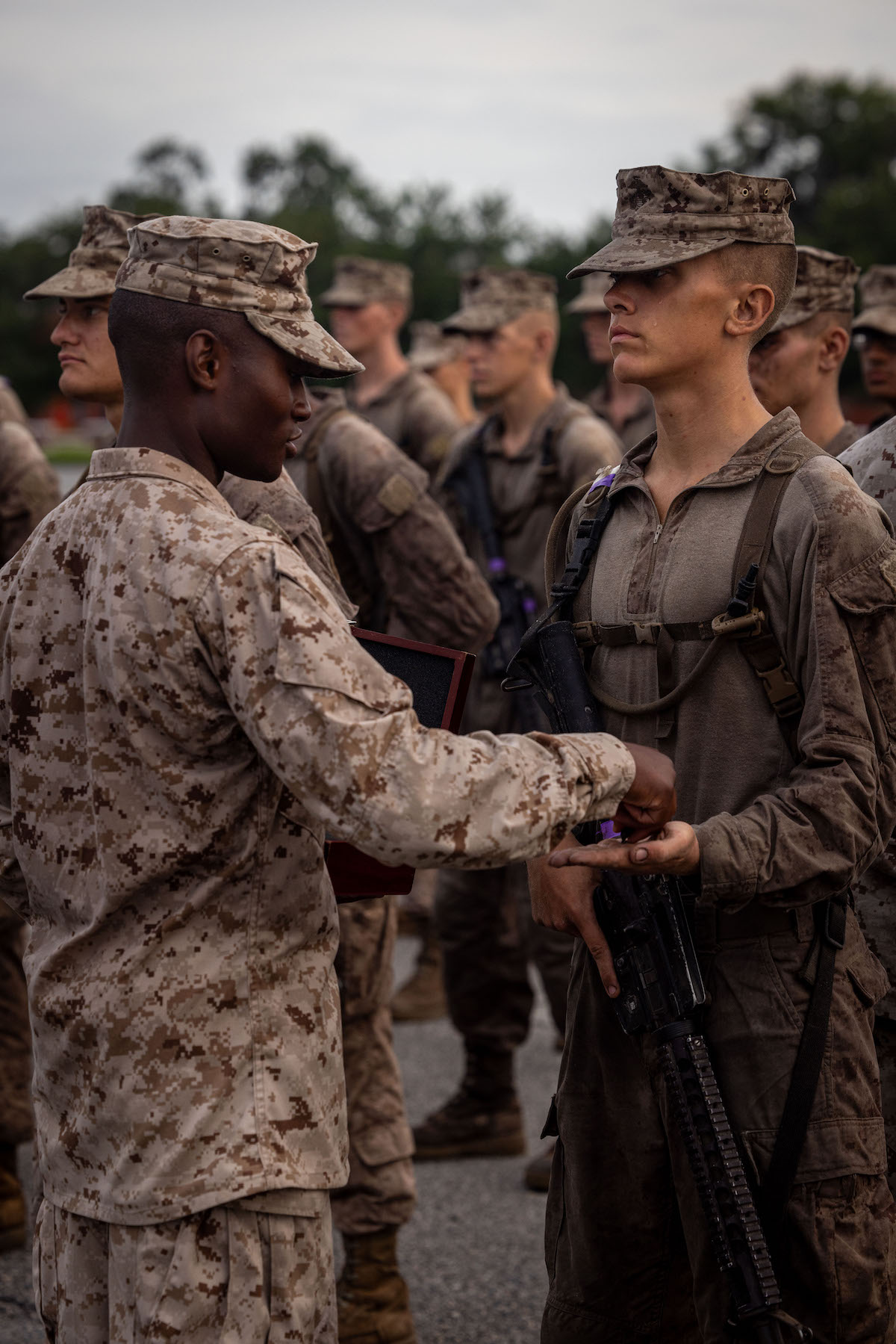 The nation’s newest U.S. Marines with Charlie Company, 1st Recruit Training Battalion, receive their Eagle, Globe and Anchor on Saturday, Aug. 2, 2025, aboard Marine Corps Recruit Depot Parris Island. The presentation of the Eagle, Globe, and Anchor, marks the successful transformation from recruit to United States Marine. Cpl. Dakota Dodd/USMC