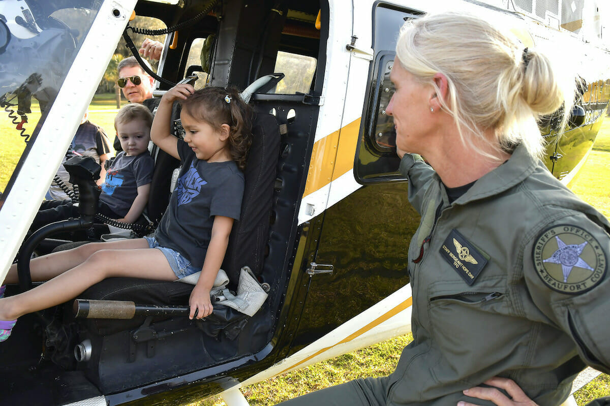 Staff Sgt. Hope Day, right, co-pilot of the Beaufort County Sheriff’s Office’s helicopter, chats with Addison Ortiz, 4, as she sits in the cockpit of the Bell OV-58 “Kiowa” on Monday during Chill With A Cop at Southside Park. In the background is Col. Neil Baxley of the Beaufort County Sheriff’s Office. Baxley is the pilot of the helicopter. Photos by Bob Sofaly/The Island News