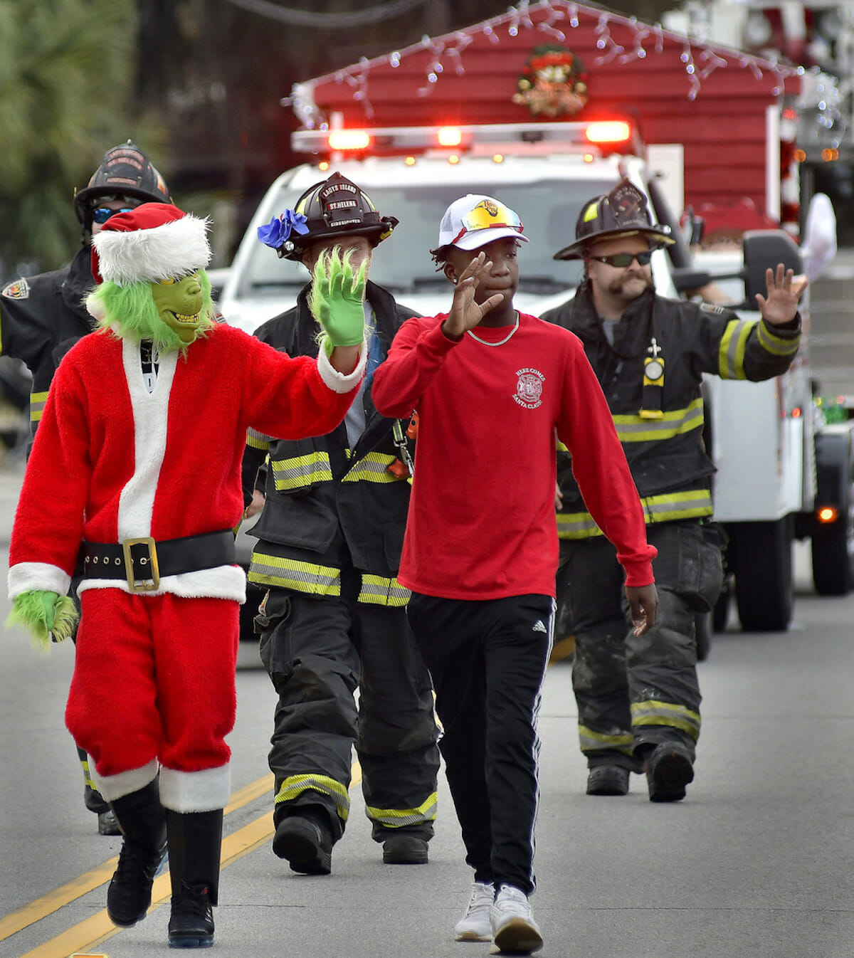 The Grinch was on hand for the annual Beaufort Christmas Parade on Sunday. Here, he walks with some of the Lady’s Island/St. Helena Fire Department’s finest.