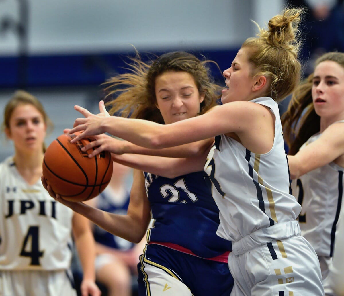 John Paul II’s Taylor Michael, right, has her hands full while trying to steal the ball from Cathedral Academy’s JuJu DeSouza during first quarter of thier basket ball game Friday night. The visiting Lady Generals went on to win the contest 52-39.