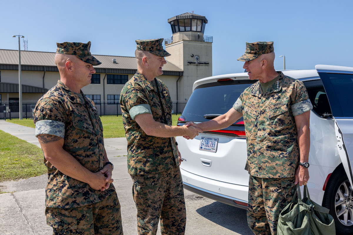 U.S. Marine Corps Gen. Eric Smith, 39th Commandant of the Marine Corps, speaks with Col. Mark Bortnem, commanding officer, Marine Corps Air Station (MCAS) Beaufort, and Sgt. Maj. Bryan Alfaro, on Monday, Aug. 19, 2024, aboard MCAS Beaufort. Smith and the 20th Sergeant Major of the Marine Corps, Sgt. Maj. Carlos A. Ruiz, landed on MCAS Beaufort and traveled to Marine Corps Recruit Depot Parris Island to speak with the Marines, sailors, and civilian personnel about leadership and the future of the Marine Corps. Lance Cpl. Nathan Saucier/USMC