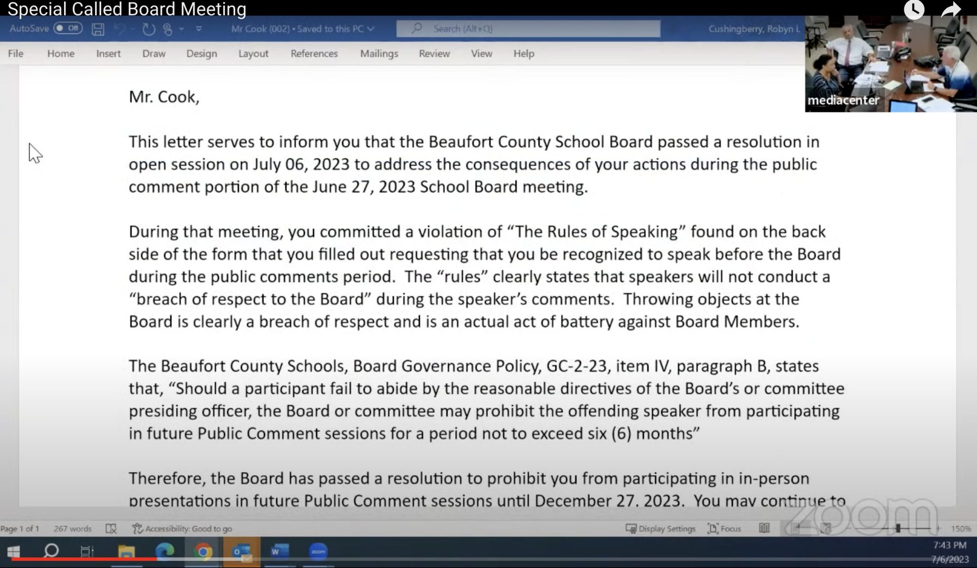 In a draft of the letter as seen in the video footage posted live to the Beaufort County School Board’s YouTube page from Thursday’s special meeting, Cook is advised that the school board has passed a resolution to prohibit him from “participating in in-person presentations in future public comment sessions until December 27, 2023.”