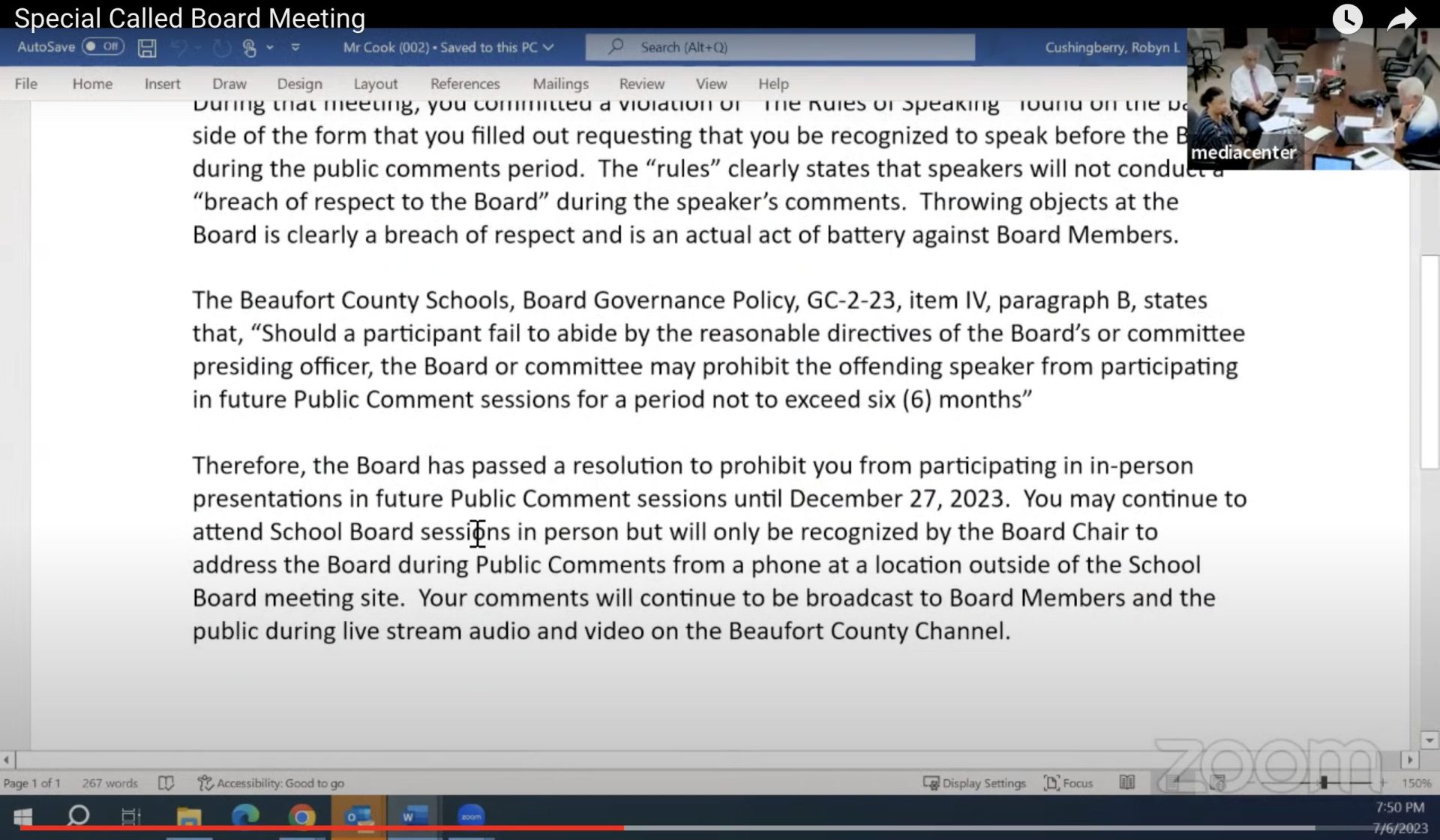 The decision to prohibit Cook from speaking in person for six months was made in accordance with the Beaufort County Schools, Board Governance Policy, GC-2-23, item IV, paragraph B, which states: Should a participant fail to abide by the reasonable directives of the Board’s or committee presiding officer, the Board or committee may prohibit the offending speaker from participating in future public comment sessions for a period not to exceed six (6) months.