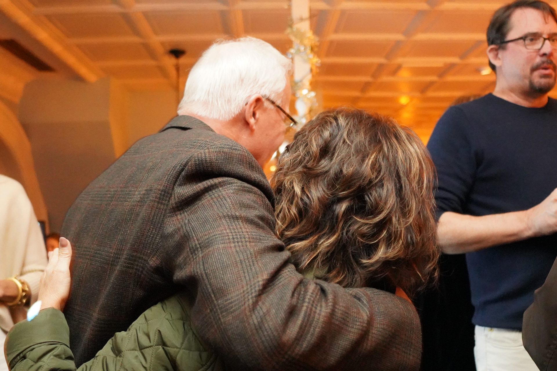 Phil Cromer hugs Mary Thibault on Tuesday, Dec. 12, 2023, at the Cromer at Panini’s in downtown Beaufort. Ultimately, Cromer handily won the Special Election for Mayor of the City of Beaufort. Amber Hewitt/The Island News