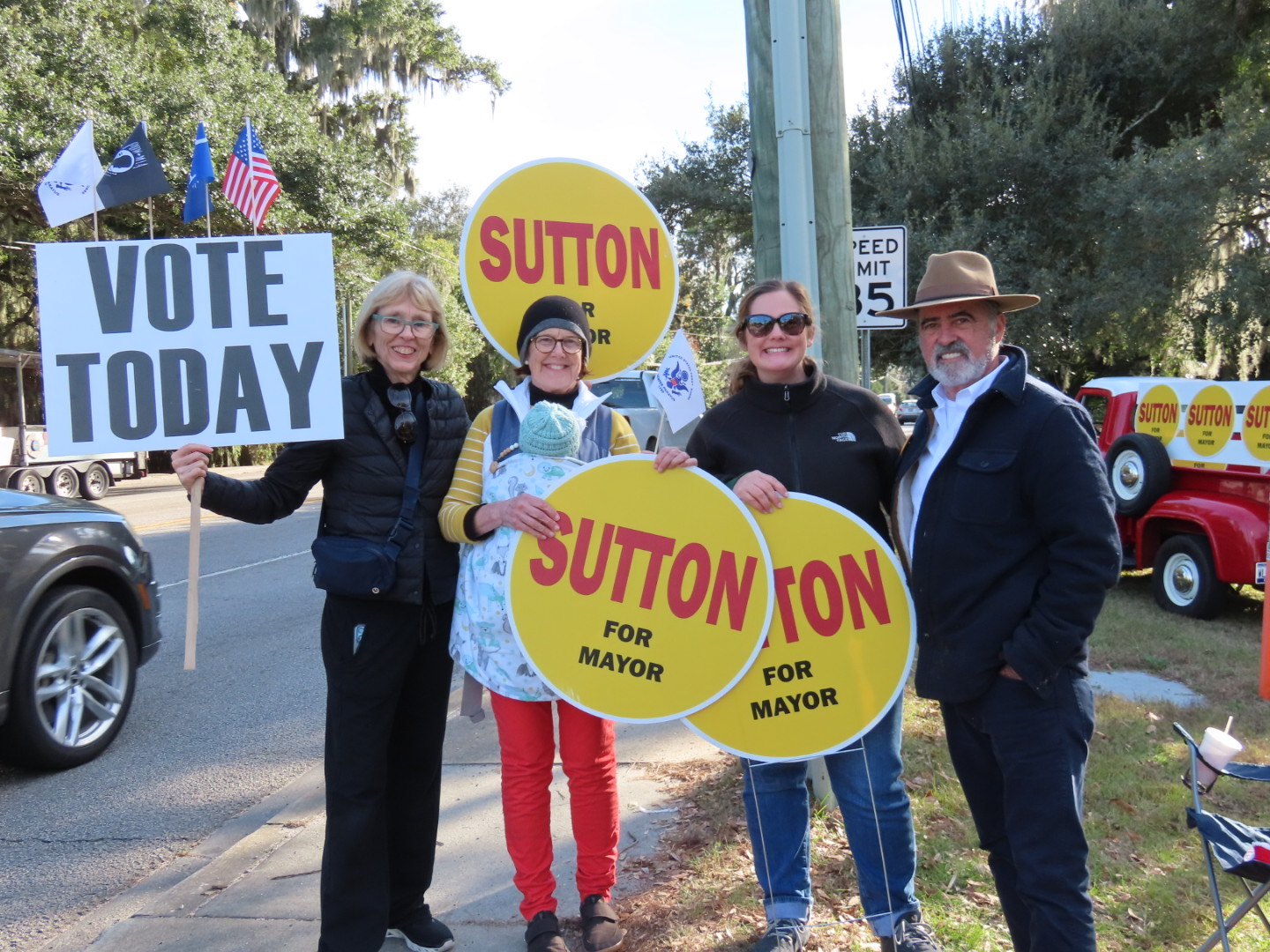 From left, Nan Sutton, Anne Gannt (holding baby Van Corns), Elizabeth Gannt and candidate for Mayor of the City of Beaufort Mike Sutton campaign Tuesday, Dec. 12, 2023 on the corner of Bay Street and Depot Road. Amber Hewitt/The Island News