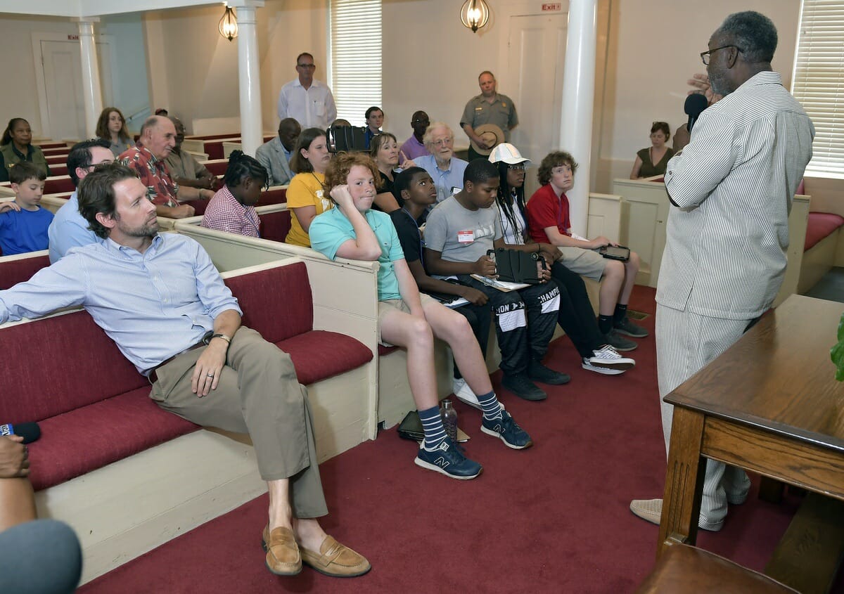 Bottom: The Rev. Abraham Murray of Brick Baptist Church near Penn Center on St. Helena Island, address those participating in the Reconstruction Era tour of of Penn Center. Seated at left is U.S. Congressman Joe Cunningham, D-SC.