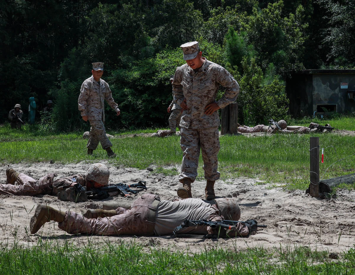 U.S. Marine Corps SSgt. Richard Macas, a drill instructor with Delta Company 1st Recruit Training Battalion, motivates a recruit, August 15, 2024, during the Crucible on Marine Corps Recruit Depot Parris Island. The Crucible is a 54-hour culminating event in which the previous 11 weeks of training are put to the test. Lance Cpl. Jordy Morales/USMC