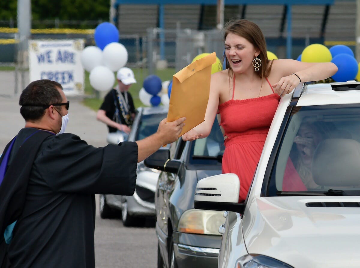 Battery Creek High School graduated 160 seniors during its first “drive-by” graduation on Monday afternoon at the school. Seniors reached out of their cars and were presented their official diploma by BCHS Principal Chad Cox. Above, Cox presents Olivia Grace Gee, ranked No. 8 in the senior class, with her graduation package.