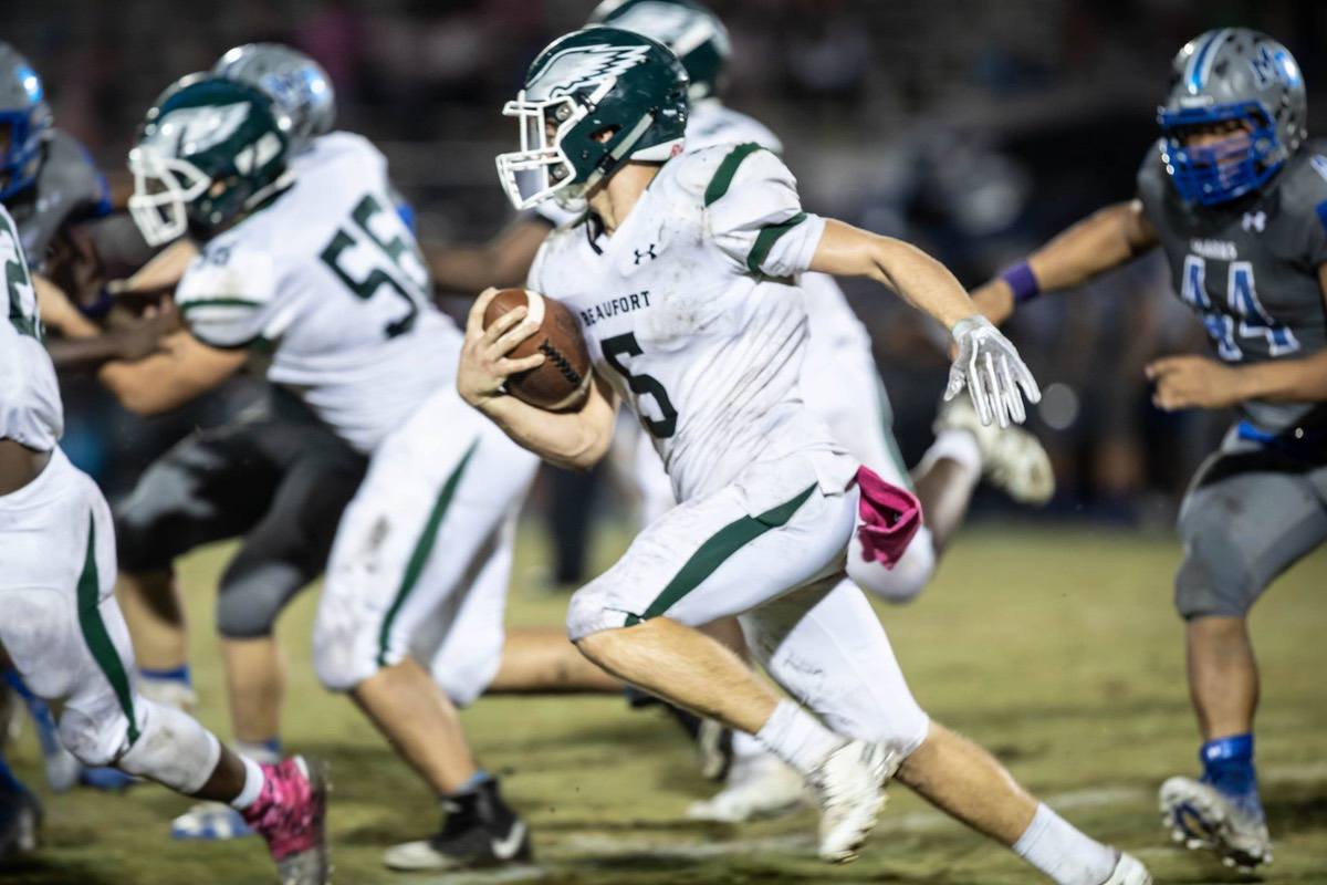 The Eagles, playing without head coach DeVonte Holloman after his younger sister passed away late last week, seized the early momentum. After a goal-line stand resulted in a missed field goal by the Sharks, Jeffrey Smyth broke two long runs on quarterback draws to set up James Dagin’s 3-yard touchdown run, giving Beaufort a 7-0 lead.