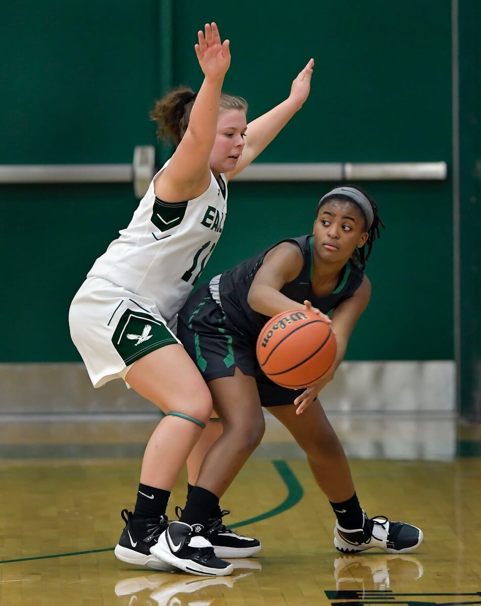Bluffton’s Tacoya Heyward, right, has nowhere to go is forced to pass the ball as Beaufort’s Margaret Hiers puts the pressure on during the first half of their Region 8, 3A game Friday night at BHS. Beaufort’s defensive efforts weren’t enough as Lady Bobcats out scored the Lady Eagles 27-49.