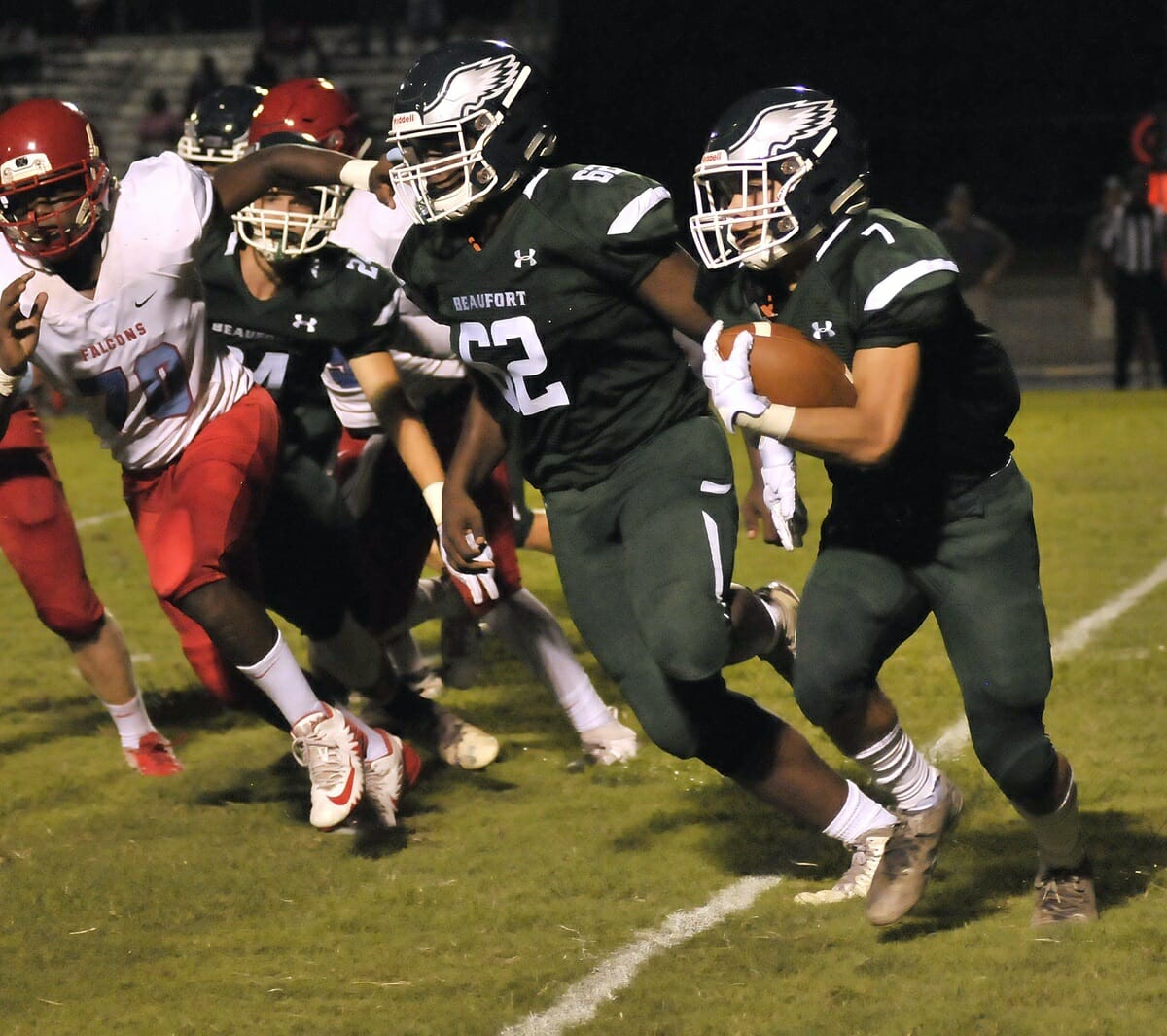 The Eagles trailed 14-7 at halftime before Smyth hit tight end William Winburn for a touchdown to tie it early in the third. The first of Dagin’s touchdown runs put Beaufort ahead, but the Falcons returned the ensuing kickoff for a touchdown to knot it at 21.