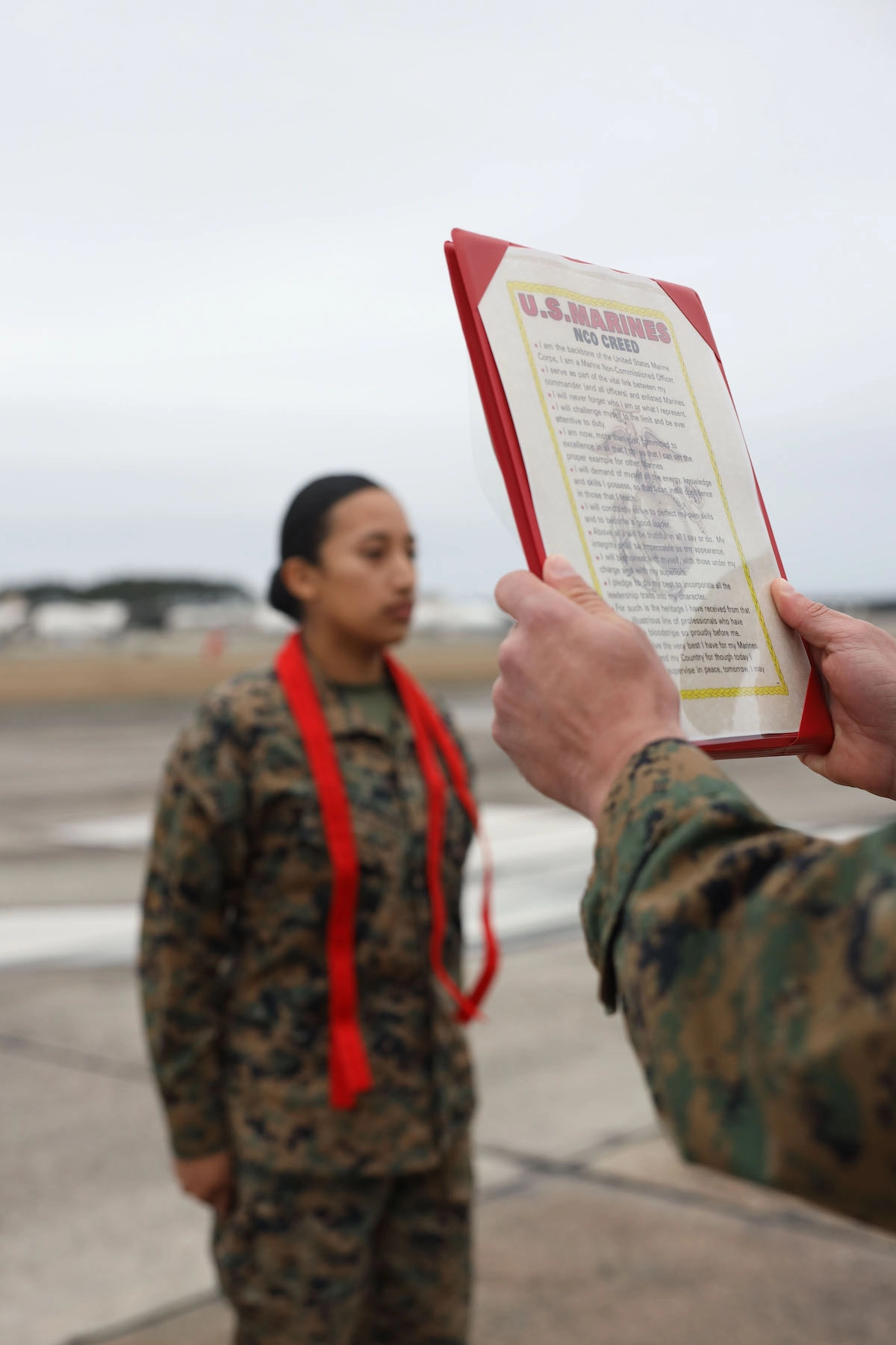 The Non-Commissioned Officer’s Creed is read during a promotion ceremony Friday, March 1, for U.S. Marine Corps Cpl. Johana Gordillo, aviation operations specialist, Headquarters and Headquarters Squadron, Marine Corps Air Station (MCAS) Beaufort. Promotion ceremonies are a significant achievement in a service member’s career and are a testament to their commitment, mastery of duties and skills, and leadership capabilities. Marines take on greater responsibilities as Non-Commissioned Officers after showing exemplary leadership skills. Lance Cpl. Delilah M. Romayor/USMC