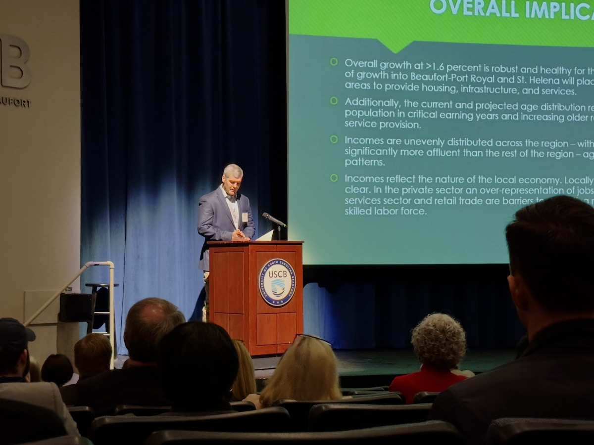 Graham Somerall, Board Chairman of the Beaufort Regional Chamber of Commerce, gives opening remarks on Friday, Feb. 16, 2024 at the annual Economic Forecast at the USCB Center for the Arts. Amber Hewitt/The IslandNe