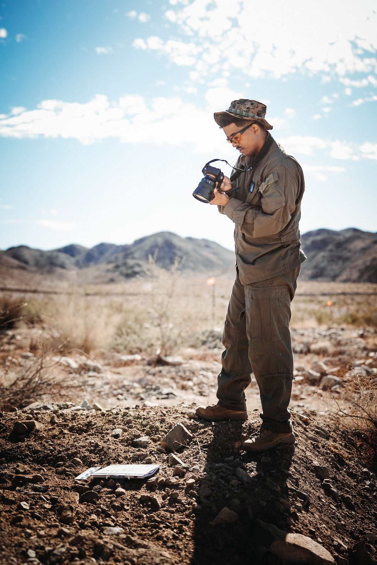 U.S. Marine Corps Staff Sgt. Habtamu Sharew, a Beaufort, S.C. native, explosive ordnance disposal technician with Marine Corps Detachment, EOD Technology Division, Indian Head Naval Surface Warfare Center, captures imagery of explosive aftermath November 28 during a Standoff Munitions Disrupt test at Marine Corps Air-Ground Combat Center, Twentynine Palms, Calif. Infantry Weapons Marine Corps Systems Command personnel conducted weapons testing at MCAGCC in order to collect test data using the Special Application Scoped Rifle, Semi-automatic Sniper System, and MK22 against several high explosive filled ordnance items. Lance Cpl. Richard PerezGarcia/USMC