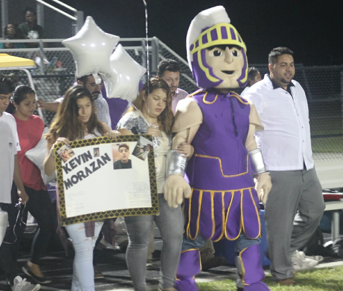 During an emotional halftime ceremony, a couple dozen friends and family members made their way to midfield, where Carlos, in full Warrior costume, mimed hugging gestures and blew kisses to the crowd. After a balloon release, the group made its way to the home sidelines, where Carlos comforted a weeping group of Whale Branch cheerleaders.