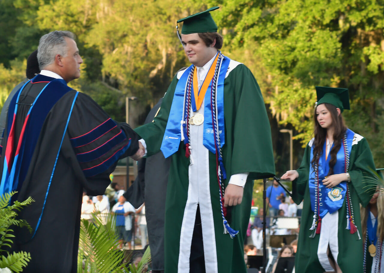 Above: Beaufort County School Superintendent Frank Rodgriguez, left, congratulates Caleb Ernest Henry, center, as the top ranked graduating senior during Commencement Exercises for the Beaufort High School Class of 2021 on Monday evening at Eagles Stadium. At right is Zoe Faith Pejsa, the No. 2 senior, waiting her turn to cross the stage. Photos by Bob Sofaly.