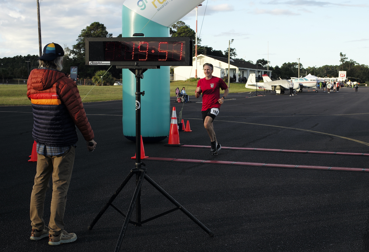 Stephen Durham of Lady’s Island was the first to cross the finish line of the Flying Frog 5K on Saturday, Oct. 12, at the Beaufort County Executive Airport. The 54-year-old set the overall race record with a time of 19:51.5 and a 6:24 pace. Asa Aarons/The Island News